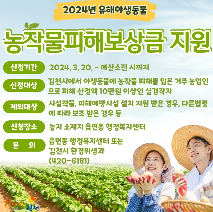 [뉴스서치] 김천시는 유해야생동물로 인한 농작물 피해보상금 지원 사업을 한다. 지원 사업은 3월 20일부터 예산 소진 시까지이며, 지원 대상은 관내 농경지에서 야생동물로 인한 농작물의 피해를 본 농·임업인이며 김천시에 주소를 둔 시민이어야 한다.