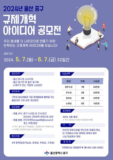 [뉴스서치] 울산 중구가 불합리한 관행과 규제를 손보기 위해 ‘2024년 규제개혁 아이디어 공모전’을 개최한다.