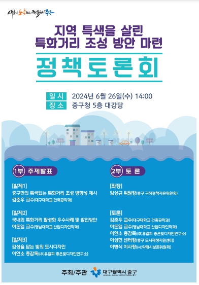 [뉴스서치] 대구 중구는 26일 오후 2시 중구청 5층 대강당에서 ‘지역 특색을 살린 특화거리 조성 방안 마련’을 위한 정책토론회를 개최한다.