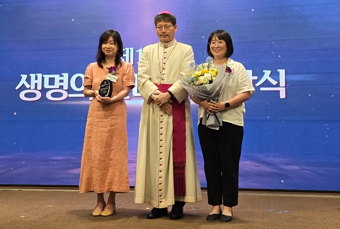 ▲ 김송희 대전자모원 원장(사진 왼쪽), 정순택 생명위원회 위원장(사진 가운데), 이혜경 대전자모원 사무국장(사진 오른쪽)이 생명의 신비상 수상 기념사진을 촬영하고 있다. |