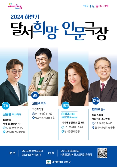 [뉴스서치] 대구 달서구가 2024년 하반기 달서희망인문극장을 7월 23일 심용환 역사학자의 강연을 시작으로 12월까지 4회 실시한다.