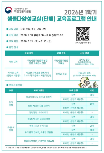 [뉴스서치] 기후에너지환경부 소속 국립생물자원관(관장 유호)은 2월 19일부터 유아(3~5세), 어린이(6~12세) 및 청소년(13~18세) 단체를 대상으로 2026년 1학기 생물다양성교육 참가자를 모집한다고 밝혔다.