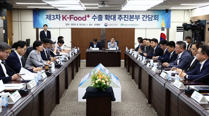 [뉴스서치] 농림축산식품부 송미령 장관은 8월 20일, 서울 에이티(aT) 센터에서 주요 농식품 및 농산업 수출기업, 유관기관과 함께 2025년 제3차'케이-푸드 플러스(K-푸드+) 수출확대 추진본부 간담회'를 개최했다.