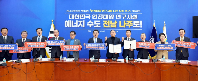 전남도는 이날 김영록 도지사, 김원이 민주당 전남도당위원장, 신정훈 국회 행정안전위원장, 박지원·이개호·조계원·김문수·권향엽 국회의원과 윤병태 나주시장 등이 참석한 가운데 국회 민주당 원내대표 회의실에서 ‘인공태양 연구시설 전남 나주 유치 전남 국회의원 공동결의문’을 발표했다. 오후에는 광주를 지역구로 둔 안도걸·전진숙·정준호 국회의원과 국회 소통관에서 공동결의문을 발표, 인공태양 연구시설 유치 노력에 힘을 실었다.