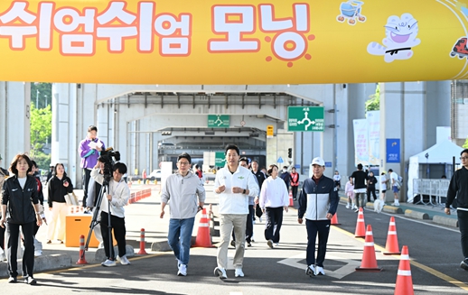 이날 ‘쉬엄쉬엄 모닝’은 반포한강공원 달빛광장을 출발해 잠수교 남단을 지나 출발점으로 되돌아오는 2km 순환코스다. 오 시장은 쉬엄쉬엄 모닝과 도착지점에 마련된 ‘찾아가는 서울체력장’에서 높이 뛰기 등 프로그램에 참여했다.