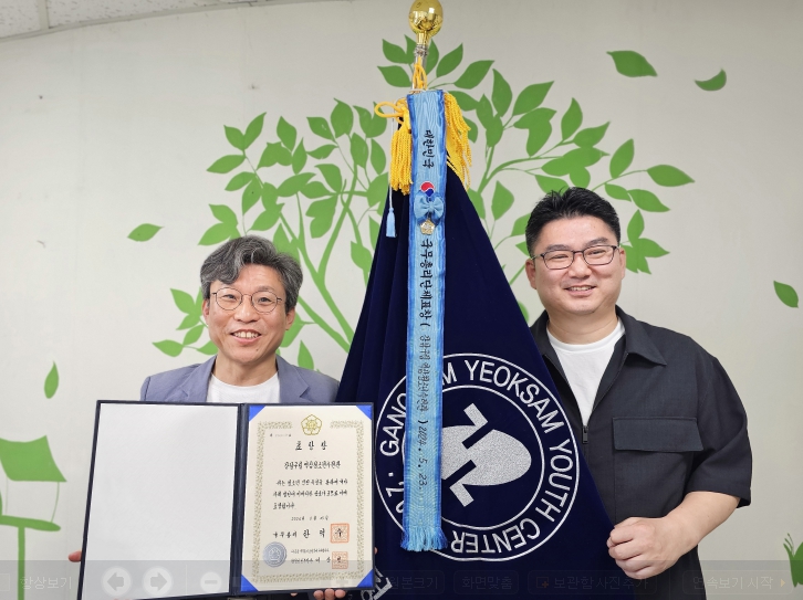 ▲ 표창장을 준 역삼청소년수련관 관계자들. 황의선 관장(왼쪽), 장성주 부장(오른쪽) |