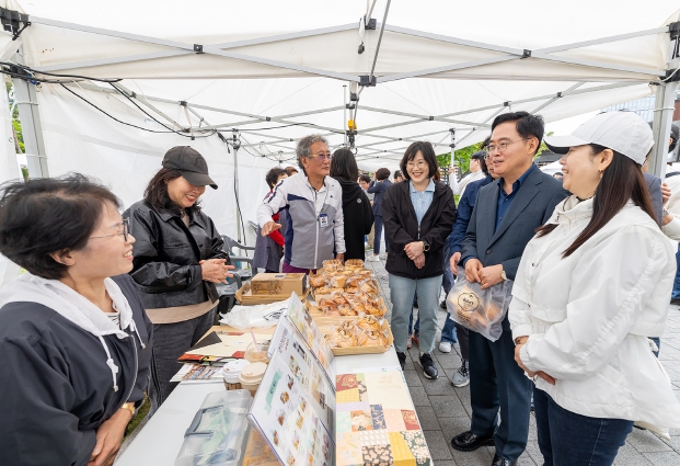 ▲ 진교훈 서울 강서구청장(오른쪽 두 번째)이 11일(토) 발산역 1번 출구 일대에서 열린 ‘사’회적경제기업과 ‘봄’맞이 나들이를 주제로 열린 ‘사봄마켓’을 찾아 빵과 쿠키를 구매하고 참가자들과 대화를 나누고 있다. |