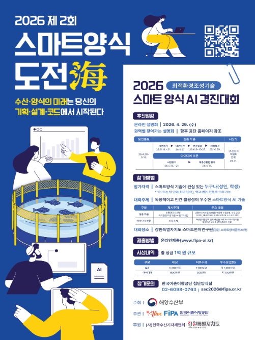 [뉴스서치] 해양수산부와 한국어촌어항공단(이사장 홍종욱)은 4월 20일부터 5월 15일까지 ‘제2회 스마트양식 도전해(海) 경진대회’의 공모를 실시한다고 밝혔다.