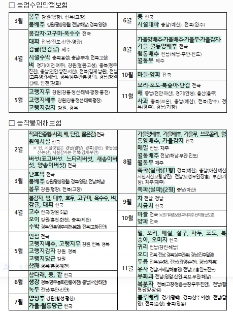 벼는 지난해 4개 시·군을 대상으로 운영했고, 올해 16개 시·군에 신규 도입하여 총 20개 시·군에서 확대 운영된다. 아울러, 봄배추·봄무는 평창 등 주산지 중심으로 시범 운영에 착수하는 한편, 봄감자·고구마·옥수수는 전국으로 확대하여 운영한다.