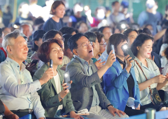 ▲ 진교훈 서울 강서구청장(앞줄 왼쪽 세 번째) ‘한여름 밤의 뮤직콘서트’에서 휴대전화 손전등을 흔들며 지역 주민들과 함께 공연을 즐기고 있다. |