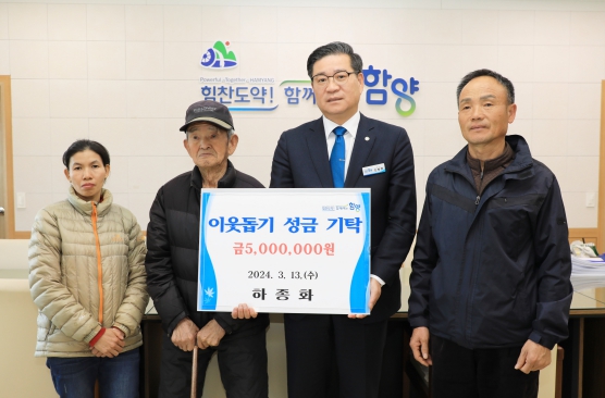 [뉴스서치] 함양군은 13일 오후 백전면 하종화(91) 어르신이 함양군청을 찾아 지역의 어려운 이웃을 위해 써달라며 이웃돕기 성금 500만 원을 기탁했다고 밝혔다.