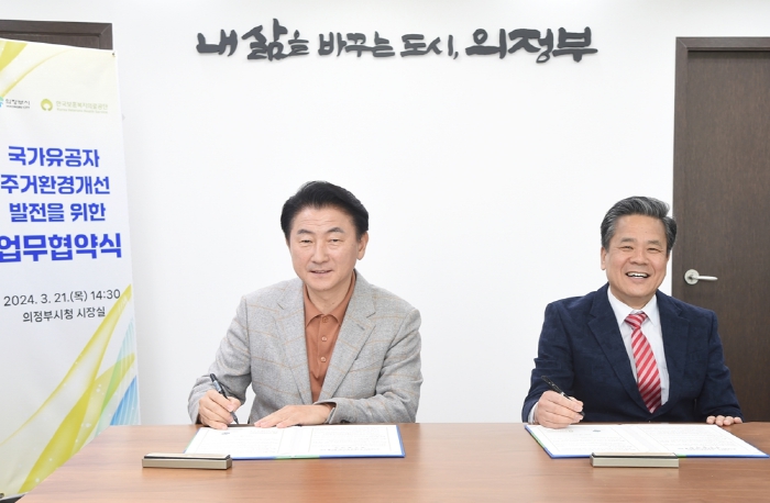 ▲ 김동근 시장이 3월 21일 시장실에서 열린 ‘국가유공자 주거환경개선 발전을 위한 업무협약식’에서 한국보훈복지의료공단 신현석 사업이사와 기념사진을 찍고 있다. |