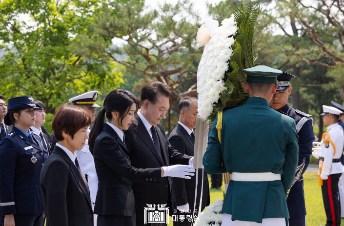[뉴스서치] 윤석열 대통령 부부는 6월 6일 오전 국립서울현충원에서 '대한민국을 지켜낸 당신의 희생을 기억합니다'를 주제로 열린 제69회 현충일 추념식에 참석했다. 올해 추념식은 국가유공자와 유족, 정부 주요 인사, 국회의원, 軍 주요 직위자, 중앙보훈단체장, 일반시민 등 5,000여 명이 참석해 순국선열과 호국영령의 명복을 빌고 위훈을 기렸다.