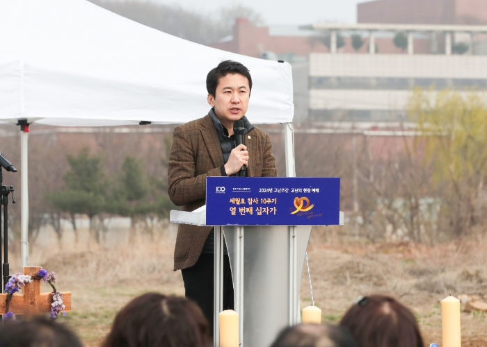 ▲ 안산시의회 송바우나 의장이 29일 단원구 초지동 4.16생명안전공원 부지에서 열린‘세월호 참사 10주기, 열 번째 십자가’ 예배에 참석해 인사말을 하고 있다. |