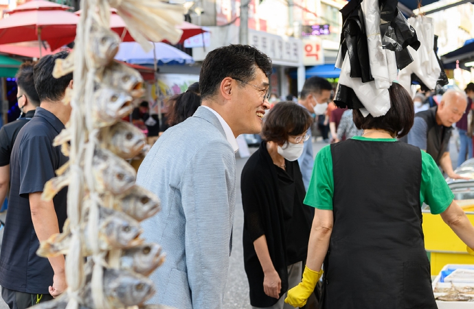 ▲ 지난 추석, 전통시장을 찾아 상인과 대화하는 이기재 양천구청장 |