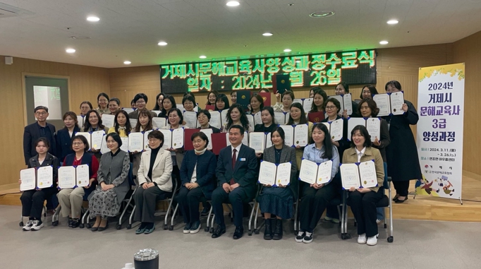 [뉴스서치] 거제시는 26일 연초면 아우름센터에서 거제시장을 비롯한 관계 공무원, (사)한국문해교육협회 관계자, 교육생 37명이 참석한 가운데 ‘2024년 거제시 문해교육사(3급) 양성과정 수료식’을 개최했다.