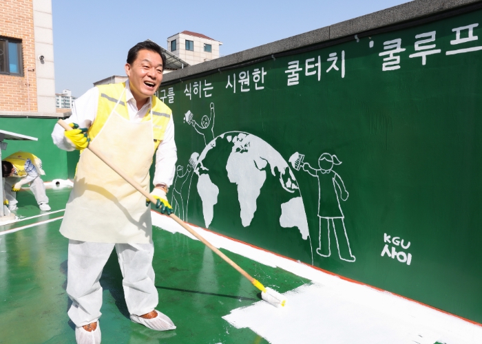 수원시자원봉사센터는 18일 곡반정경로당에서 이재준 수원시장과 허정문 수원도시공사 사장, 이영인 수원도시재단 이사장, 최순호 수원FC 단장 등 공공기관장이 참석한 가운데 지붕에 특수 도료를 칠해 경로당 내 온도를 낮추는 ‘쿨루프’를 시공했다.