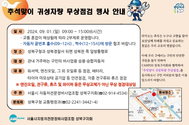 [뉴스서치] 서울 성북구는 올해 추석을 맞이해 고향을 방문하는 주민들의 안전한 차량운행을 위해 오는 9월 1일 오전 9시부터 오후 3시까지 성북구청과 성북경찰서 뒤편 성북천 쪽 일방통행로에서????추석맞이 귀성차량 무상점검 서비스????를 실시한다.