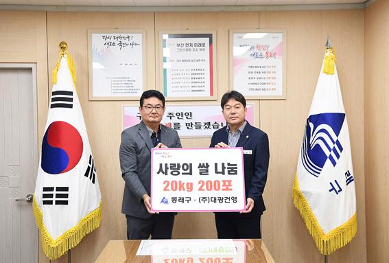 [뉴스서치] 부산 동래구는 지난달 27일 ㈜대광건영(대표 김남중)으로부터 백미 20kg 200포(940만 원 상당)를 기탁받았다고 밝혔다.