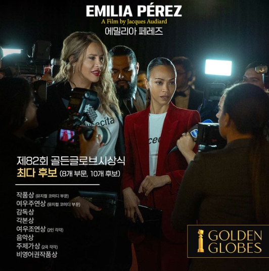 [뉴스서치] 지난 9일 저녁 발표된 제82회 골든글로브 시상식 후보 명단에서 자크 오디아르 감독의 뮤지컬 영화 '에밀리아 페레즈'가 무려 10개 후보에 오르며 최다 후보작의 주인공이 됐다.