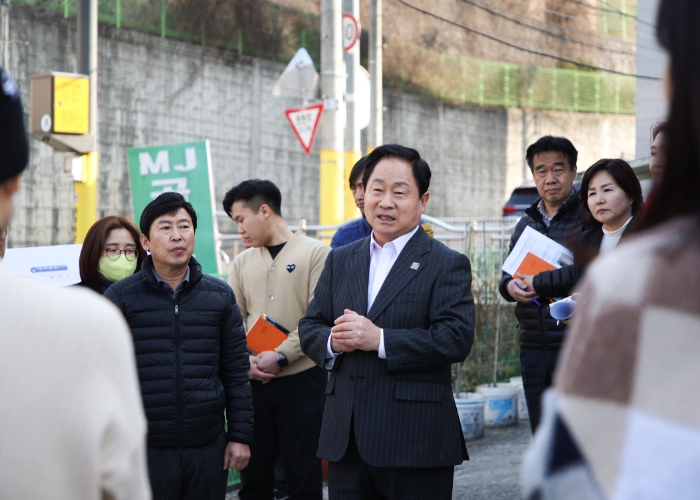 이날 주광덕 시장은 시의원, 관계 공무원, 학교 관계자 및 지역 주민들과 함께 통학로 개선 사업지를 점검하고 의견을 청취했다.