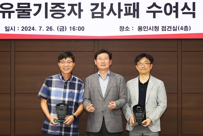 ▲ 26일 용인특례시청에서 열린 유물기증자 감사패 수여식에 참석한 이상일 용인특례시장(가운데)와 최채기 씨(왼쪽), 남진우 씨(오른쪽)의 모습 |