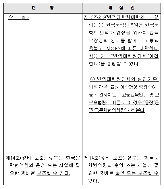 이번 「문학진흥법」 개정안에서는 한국문학번역원이 교육부 장관의 인가를 받아 번역대학원대학을 설립할 수 있도록 정부가 필요한 경비를 출연할 수 있는 근거 조항을 신설(법 제13조의2 및 제14조)했다. 이로써 국가가 우수한 번역 인재를 안정적으로 양성할 수 있는 제도적 기반이 마련됐다.