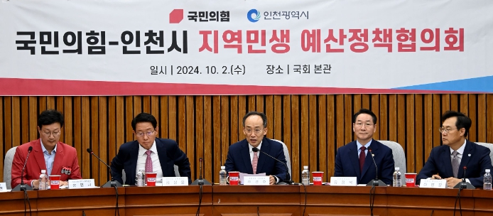 이날 협의회는 유정복 인천시장, 하병필 행정부시장, 황효진 글로벌도시정무부시장, 천준호 기획조정실장 등 인천시 주요 간부와 국민의힘의 추경호 원내대표, 김상훈 정책위의장, 손범규 인천시당 위원장, 구자근 예결위 간사 등 핵심 당직자가 참석했다.