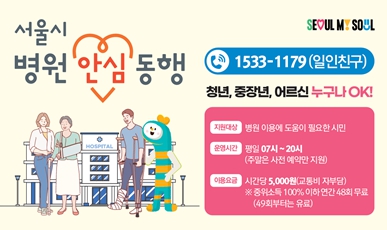 정상훈 서울시 복지실장은 “서울시 병원안심동행서비스는 1인가구, 어르신 등 시민들의 필수 의료안전망을 자리잡았다”며 “앞으로도 시민들이 필요할 때 쉽고 편리하게 서비스를 이용할 수 있도록 이용편의성을 높이고, 다양한 복지 지원을 추가해 더 많은 시민들이 이용하고 만족하도록 하겠다”고 말했다.
