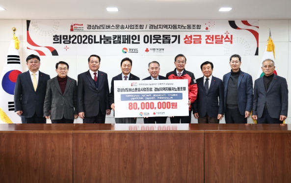 이번 성금은 함양지리산고속, 천일여객, 신흥여객자동차, 거제현대고속, 경전여객자동차, 거창고속, 부산교통, 경남지역자동차노동조합이 각각 1천만 원씩 마련한 것으로, 경남사회복지공동모금회를 통해 도내 취약계층 의료비 지원과 사회복지시설 운영에 사용될 예정이다.