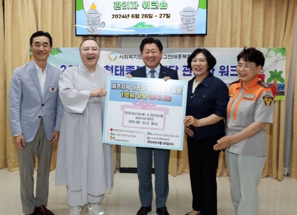 전달식에는 오영훈 지사, 천태종 복지재단 사무총장 자운스님, ㈔나누며하나되기 정책실장 문법스님, 대한적십자 제주지사장, 제주시어린이집 연합회장, 제주시 여성의용소방대 관계자 등이 참석했다.
