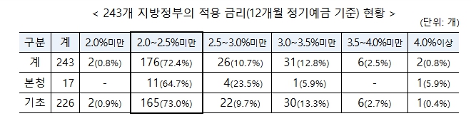 전국 243개 지방정부의 금고 이자율을 조사한 결과, 12개월 이상 정기예금 금리는 전국 평균 2.53%(공개 이자율 기준)로 집계됐다.
