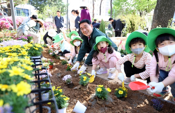 ▲ 문헌일 구로구청장이 어린이들과 꽃묘를 심고 있다. |