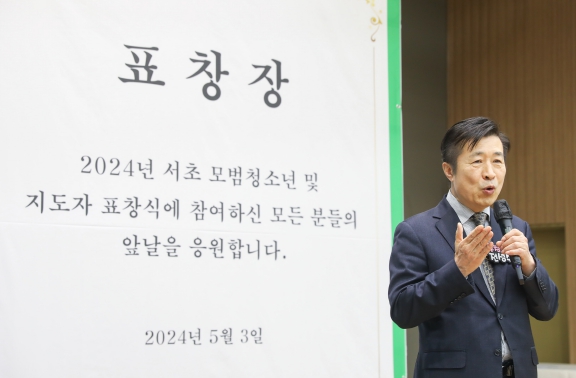 ▲ 전성수 서초구청장이 ‘모범청소년 및 유공자 표창식’ 행사에서 참석 청소년들을 격려하고 있다. |