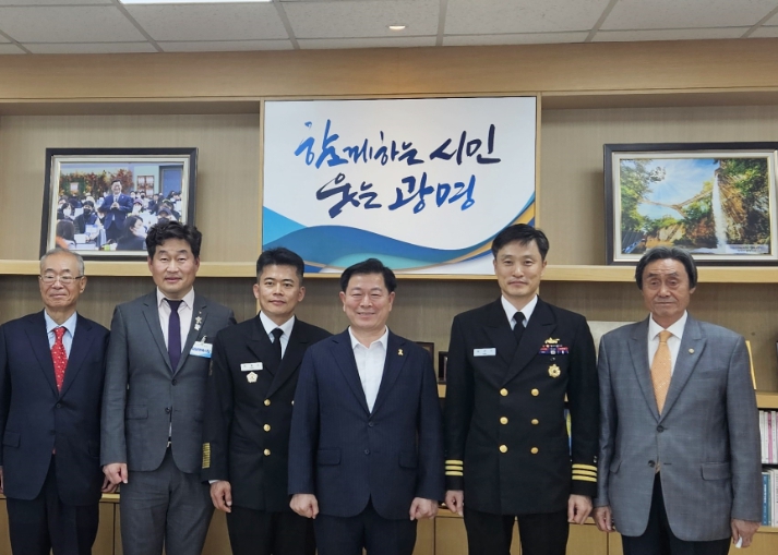▲ 광명시는 18일 무의공 이순신의 이름을 딴 잠수함 이순신함 함장이 방문해 무의공 이순신 선양회 회원들과 만남을 가졌다고 밝혔다.j |
