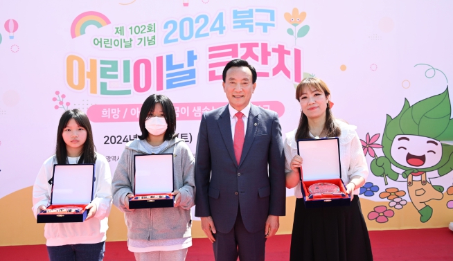 [뉴스서치] 박천동 북구청장이 4일 북구청 광장에서 열린 북구 어린이날 기념식에서 모범어린이 및 아동복지 유공자에게 표창패를 전달한 후 기념촬영을 하고 있다.