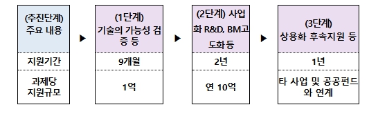 먼저, 1단계는 유망기술 발굴 및 비즈니스 모델 수립 등을 위해 총 80개의 기획과제를 지원한다. 이를 통해 기술의 시장 적합성과 사업화 가능성을 미리 검증하고 후속 R&D 과제 연계를 위한 기반을 마련한다. 이어 2단계에서는 1단계에서 수립된 기획을 바탕으로, 경쟁형 방식을 도입하여 우수기술들을 선별하게 된다. 선별된 과제들을 대상으로 비즈니스 모델 고도화, 사업화R&D 및 시제품 제작 등을 지원한다. 지원규모는 연 10억 원 수준(최대 2년)으로 총 20개의 사업화 R&D 과제를 지원할 계획이다.