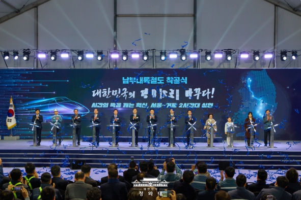 이 대통령은 이날 오전 남부내륙철도 착공식에서 기념사를 통해 "남부내륙철도가 마침내 착공한다. 이 뜻깊은 착공식을 온 국민과 함께 진심으로 축하드린다"며 이 같이 밝혔다.