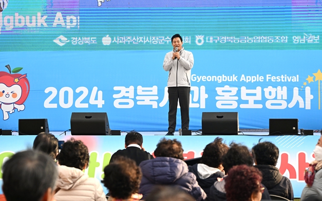 ▲ 오세훈 서울시장이 4일(월) 15시 40분, ‘2024 경북사과 홍보 행사’에 참석해 환영 인사를 전하고 있다. |