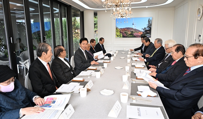 [뉴스서치] 오세훈 서울시장은 4일 파트너스하우스에서 국민의힘 상임고문단과 오찬 간담회를 갖고 서울시의 미래 발전 방안과 여당의 역할 등에 대해 의견을 나눴다.