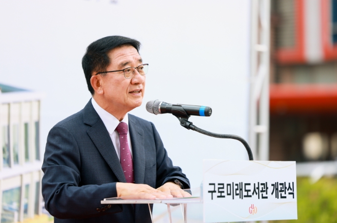 ▲ 문헌일 구로구청장이 23일 구로미래도서관 개관식에서 인사말을 하고 있다. |