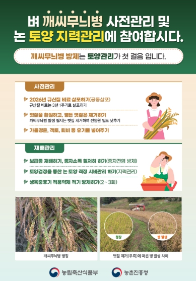 앞서 새해농업인실용교육을 통해 논 토양관리, 병해충 예방 관리 기술을 교육하고, 깨씨무늬병 예방을 위한 사전 관리 요령 안내문을 제작해 전국 시군농업기술센터에 배부했다.