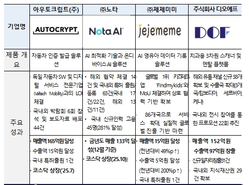 이 외에도 자동차 인증발급 솔루션 기업인 아우토크립트(주), 온디바이스 AI솔루션 기업인 ㈜노타는 지난 7월과 10월 각각 코스닥에 상장했으며, 자율주행 드론 개발 기업인 니어스랩은 25개국 이상과 수출계약을 체결했고, 치과용 3차원 스캐너 및 덴탈플랫폼을 개발하는 주식회사 디오에프는 해외 유통채널을 신규 확보하여 97억원의 수출 실적을 달성했다.