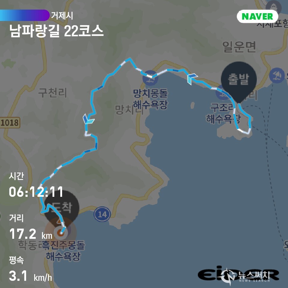 [뉴스써치] 남파랑길 거제구간 여덟 번째 코스인 22코스는 경남 거제시 일운면 구조라리 ‘구조라항여객선터미널’에서 시작하여 구조라항 배후에 있는 수정산에 오르고 다시 구조라해수욕장으로 내려간 뒤 해변을 따라 걸어 ‘망치몽돌해수욕장’을 지난 후 망치마을에서 가파른 등산로를 올라 북병산로에 접어든 뒤 동부면 경계를 지나 망치재부터 학동고개까지 거제지맥의 산들을 능선종주하는 코스로 바닷길과 산길을 모두 경험할 수 있는 난이도가 제법 있는 코스이다.