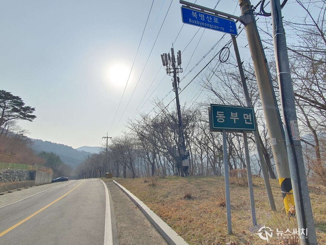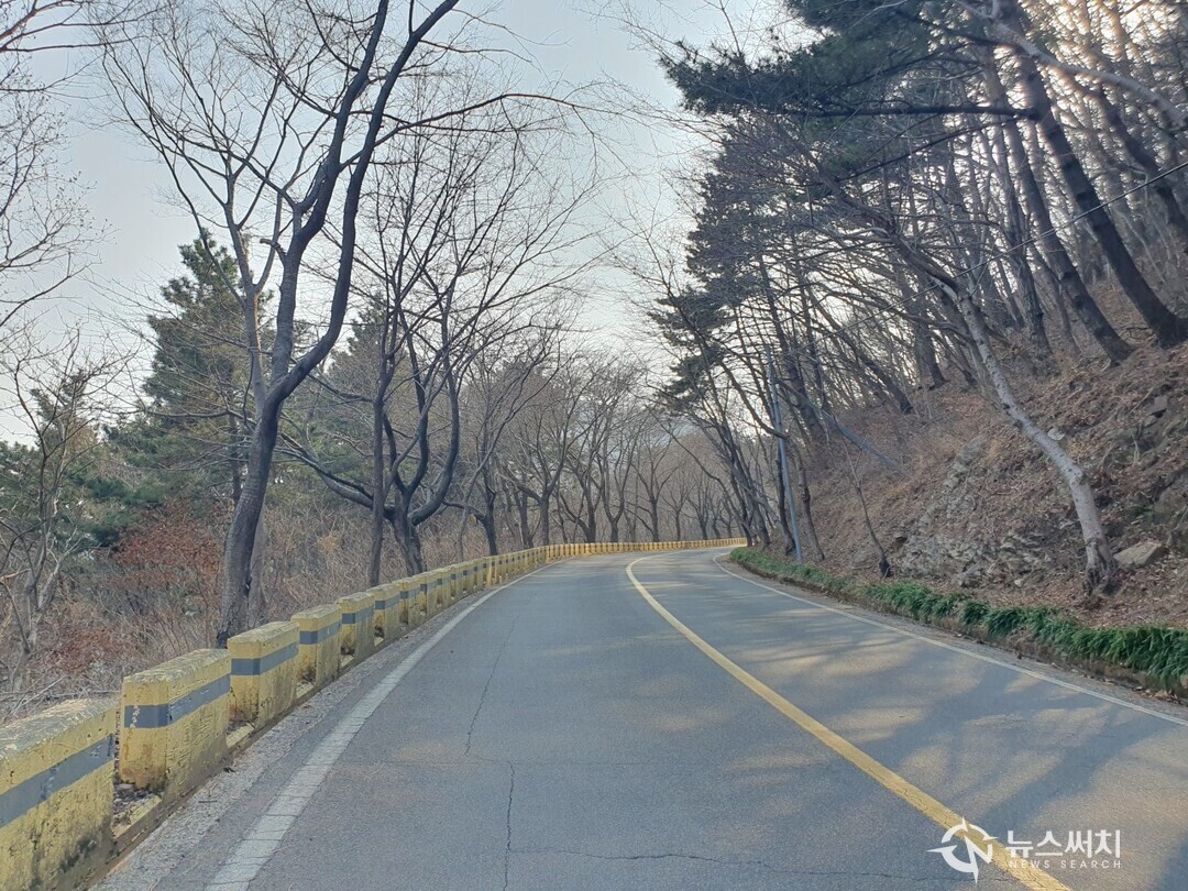 오후 3시 15분 다시 발걸음을 재개하여 북병산 쪽으로 경사가 급한 오르막 마을길 걷기를 계속하여 산간도로인 ‘북병산로’에 접어들었고 서쪽 방향으로 또다시 한참을 걸어 오후 3시 56분 일운면과 동부면의 경계인 ‘망치재’에 도착하였다.