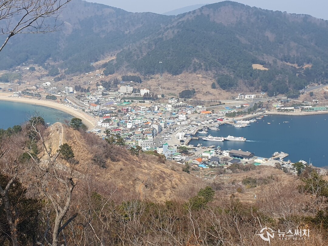 구조라방파제 끝부분에서 급경사의 산행이 시작되며 약 20분 정도의 상당히 가파른 등산로를 올라 오후 12시 53분 구조라항 배후에 있는 해발 148m 높이의 ‘수정산(수정봉)’ 정상에 도착하였다.