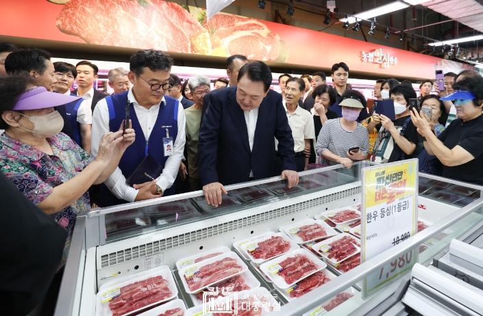 한우 코너에서는 한우 포장 팩에 적힌 가격을 하나하나 확인하며 축산물 물가를 점검했다. 장을 보던 한 고객이 대통령에게 “대통령님 음식 잘하신다는데, 미역국에 쓸 고기 대신 좀 골라주세요”라고 부탁하자, “기름기가 약간 있는 고기가 미역국 끓이기에 좋아요” “즐거운 명절 보내세요”라고 덕담을 건넸다.