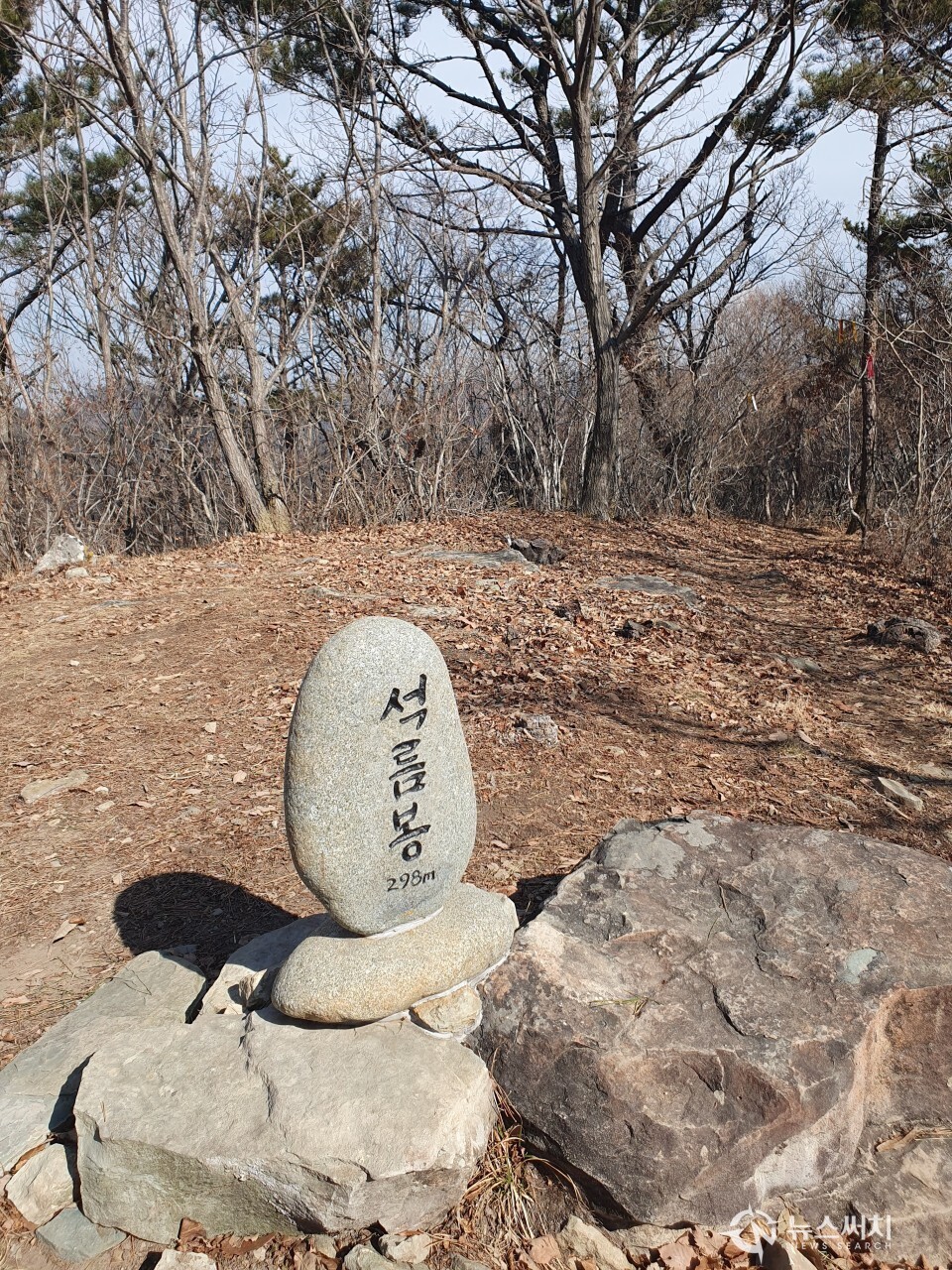 약 10여분 정도의 휴식을 마친 후 오르막 산행을 재개하였고 한참 동안 걷다 보니 두 번째 정자가 보였고 그 옆 ‘석름봉’ 정상(해발 298m)에 오후 12시 26분에 도착하였다. ‘석름봉’ 정상에는 작은 크기의 정상석이 있어 필자는 인증사진을 찍은 후 정상 정자에서 준비해온 간식을 먹으면서 잠시 휴식을 취하였다.