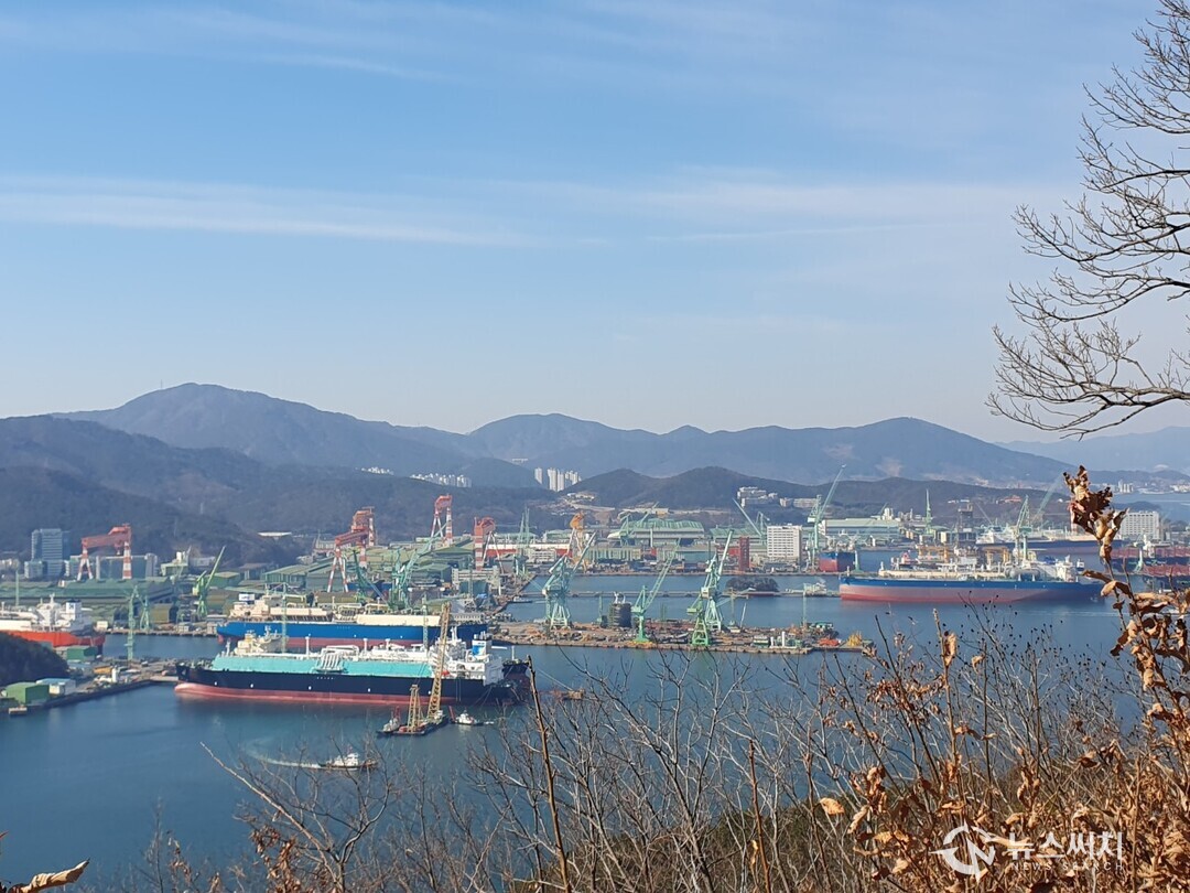 한참동안 오르막 산길을 걷다 보니 첫 번째 전망대 팔각정 정자가 보였는데, 그곳에서는 거제시 고현동, 장평동 일대가 한눈에 조망되었고 한참 개발 중인 고현항과 삼성중공업 조선소의 모습도 뚜렷이 보였다.