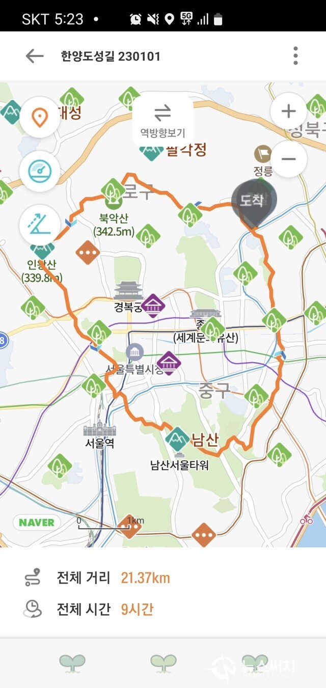한양도성길 6개구간 전체 트레킹에 걸린 시간은 점심식사 시간 및 휴식시간을 포함하여 총 9시간이 소요되었고, 전체 트레킹 거리는 21.37km 였다.
